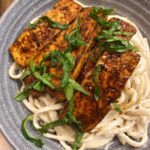 Delicious creamy vegan lemon pasta topped with a sweet and smoky warm tofu that has been caramelized! Super easy recipe to make for a healthy plant-based dinner or meal!